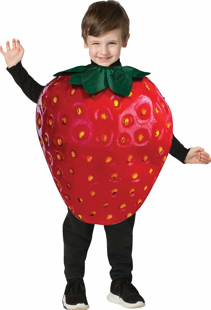 Get berry sweet wearing this Get Real Strawberry Halloween Costume! Includes a tunic, a collar headpiece and is a photo realistic printed strawberry.