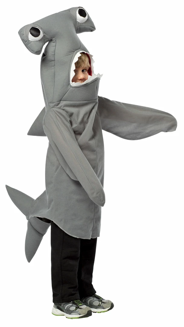 It can always be shark week in your house with this great hammerhead shark costume! Costume includes one gray polyester tunic complete with tail, fins and attached head with googly eyes!