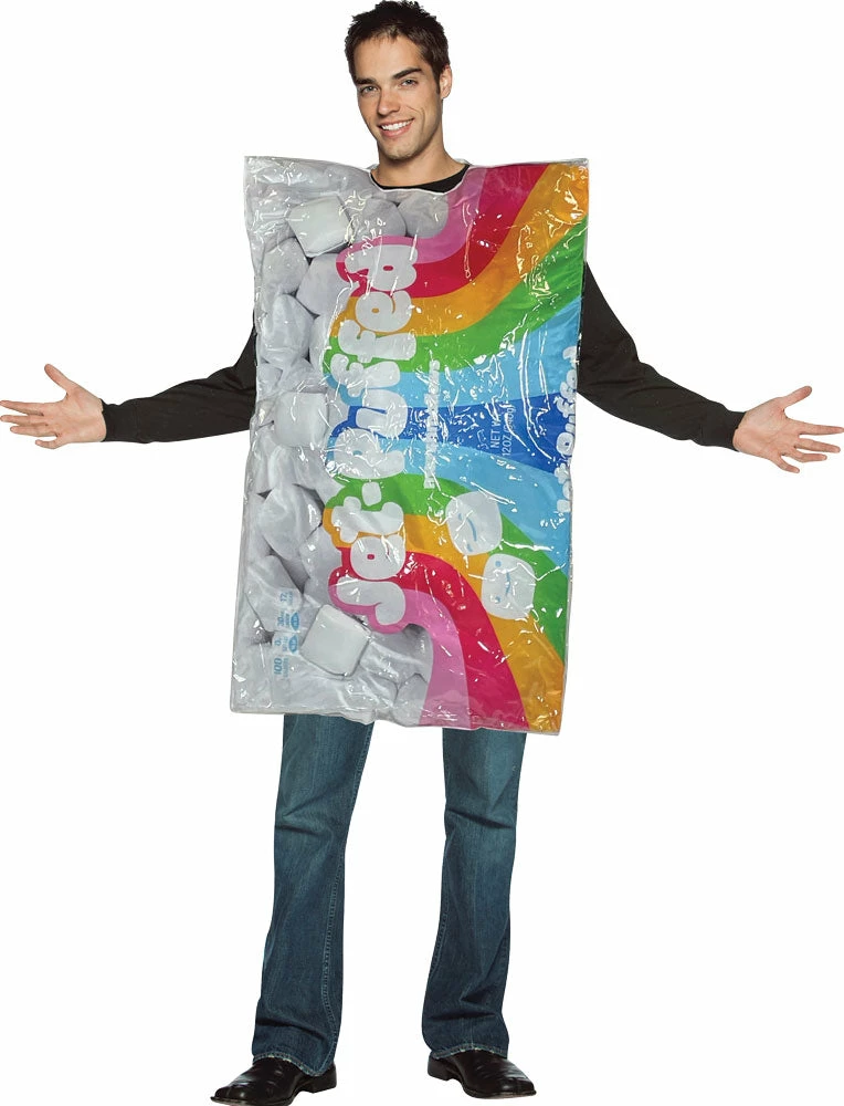 Mellow out in this sweet Kraft Jet-Puffed Marshmallows Halloween Costume. This costume includes a tunic. Printed on the front in likeness of the actual product. One size fits most adults.