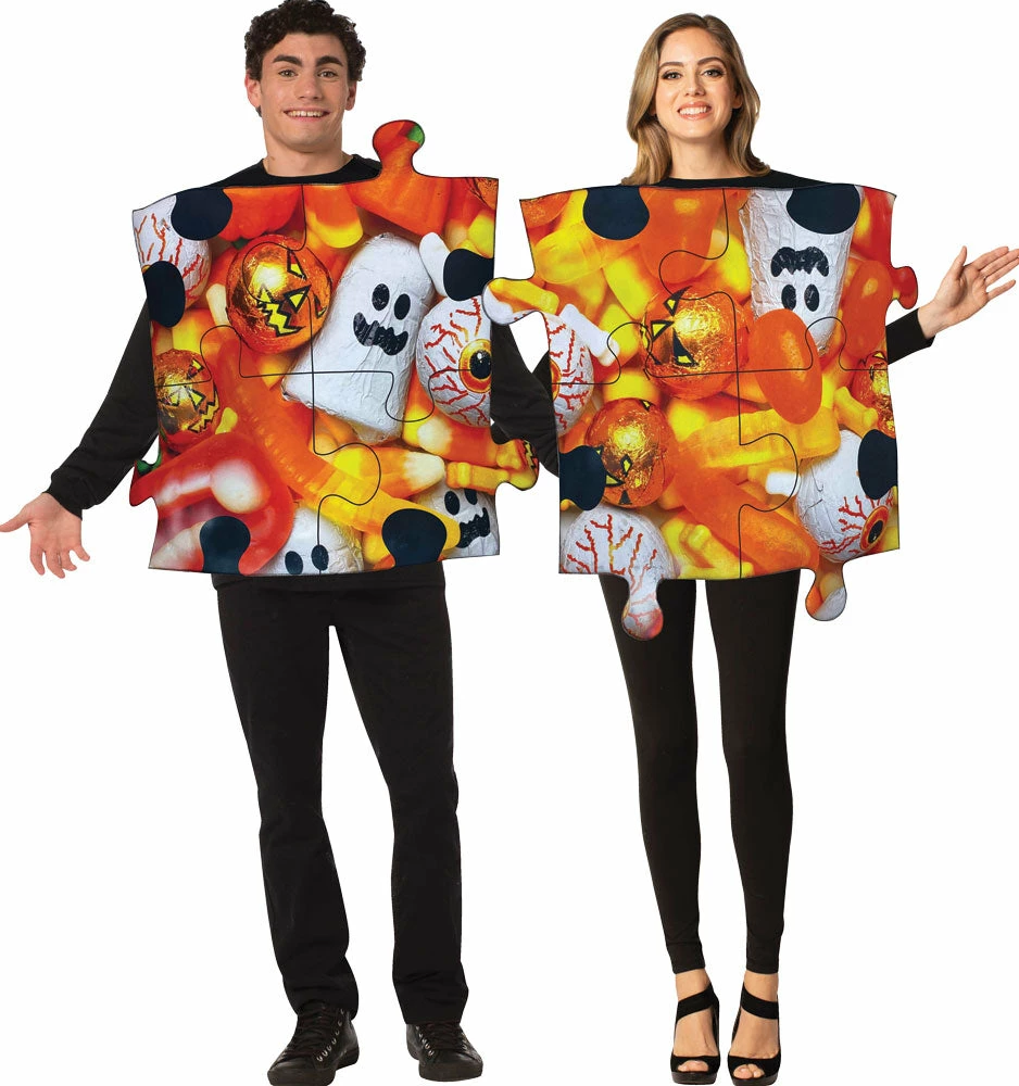 Come together and find your missing piece in this perfect combo Puzzle Pieces Halloween Candy Couples Halloween Costume! This couples costume includes 2 tunics printed on the front with this favored pastime. One size fits most adults.