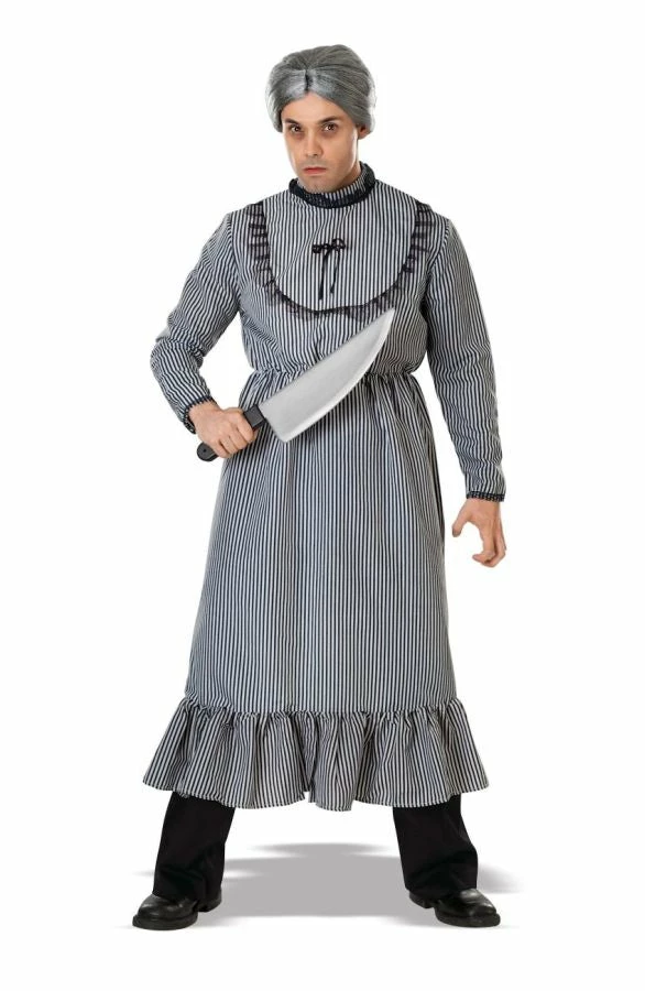 Norman you haven’t been a bad boy have you? Costume includes old style dress and grey granny wig. Standard size 38-46. Polyester.