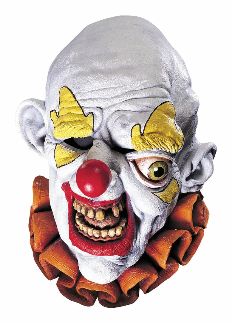 Disfigured clown face with red lips and nose, yellow eyebrows, and bulging eye., Full over-the-head latex mask.