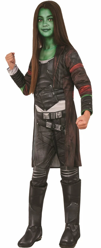 With this costume based on the character Gamora featured in Marvel Comics award-winning movie franchise Guardians of The Galaxy your little warrior can become an elite combatant being able to best most of the opponents in the galaxy. Includes deluxe padded jumpsuit with attached coat and 3D boot-tops and makeup kit.