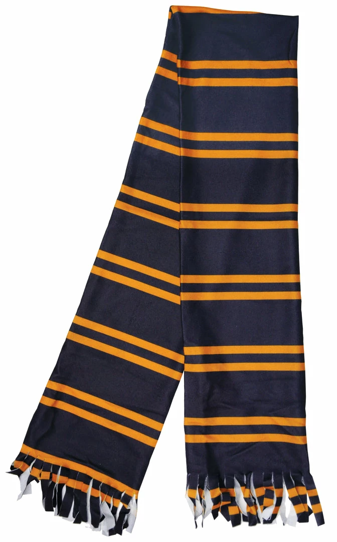 Burgundy scarf with yellow stripes and fringed ends. Adult one size.