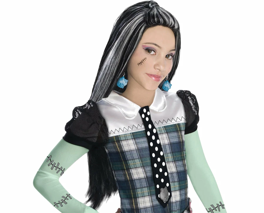 Great accessory for your Monster High Frankie Stein costume! Wig is Frankie’s classic style with black and white streaks. Hair is pulled back in front with a mesh cap underneath for a secure fit. One size fits most children. 100% synthetic fibers.