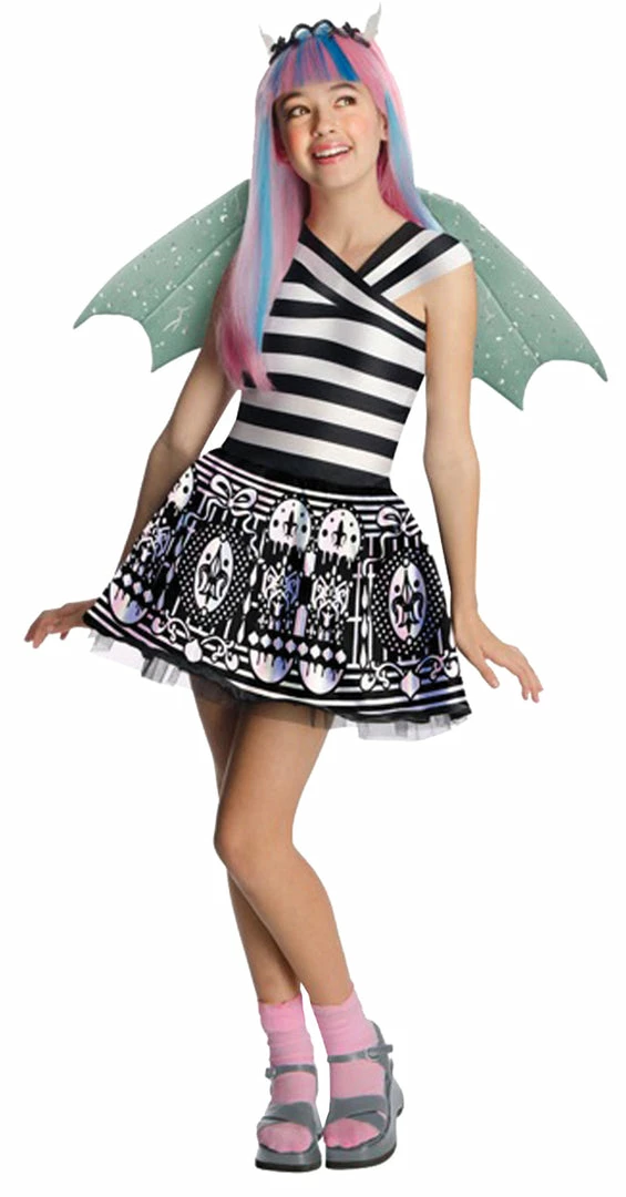 Very colorful costume modeled after the popular Monster High character! Costume includes a black and white dress and wings. Shoes and wig not included. 100% Polyester. Care instructions: Do not dry clean bleach or iron. Hand wash in cold water and dry flat.