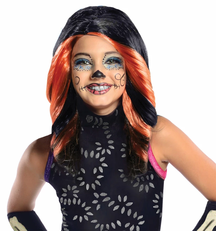 Perfect accessory for your Monster High Skelita Calaveras costume! Long black wig with marigold streaks pulled away from the face. One size fits most children. 100% synthetic fibers.
