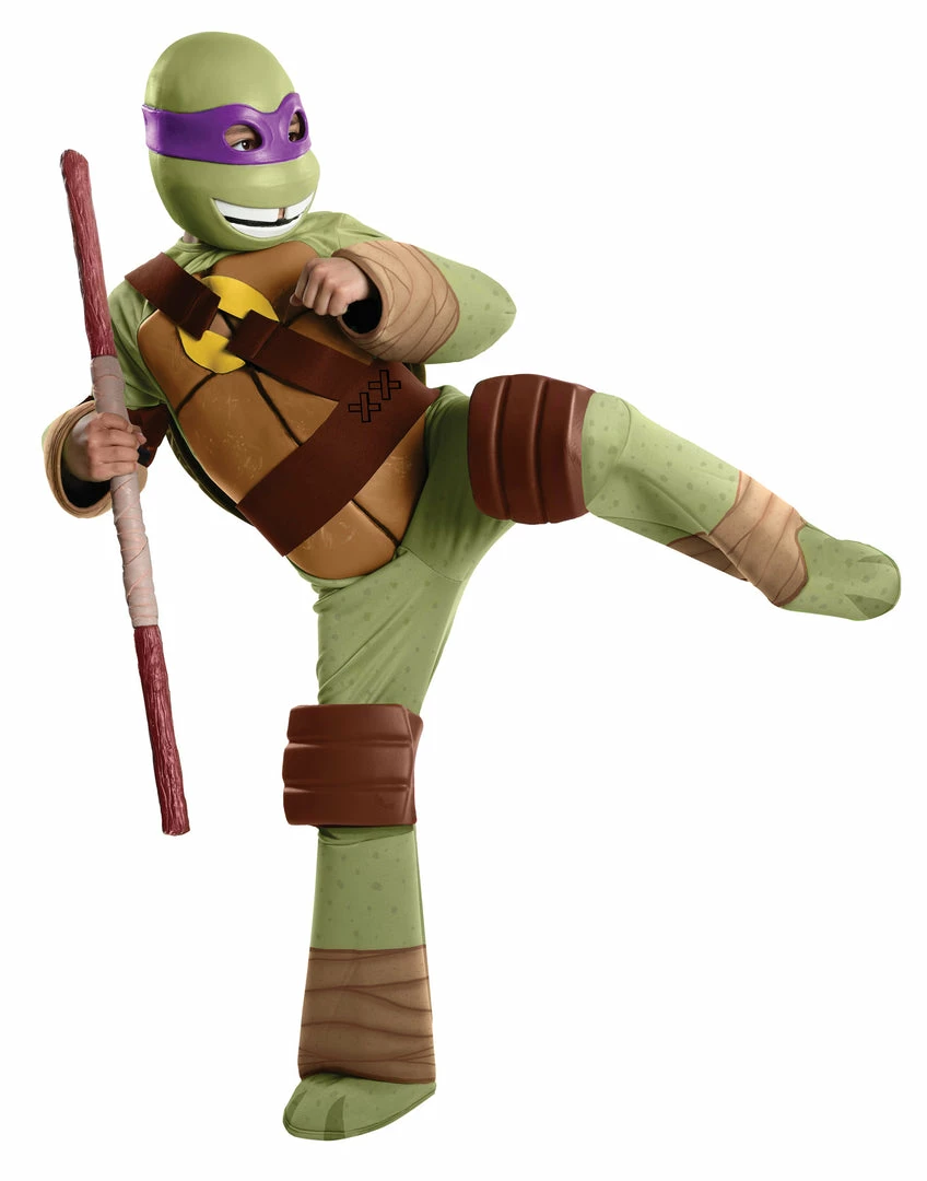 Cowabunga dudes! Check out this radical new deluxe costume for Donatello of the Teenage Mutant Ninja Turtles! Jumpsuit with molded chest and shoe covers elbow and knee pads belt and mask.