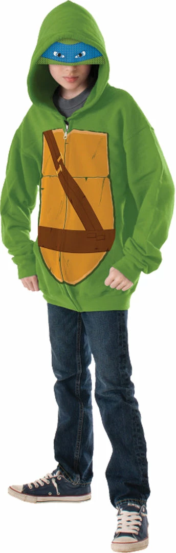 Keep yourself warm with this great Teenage Mutant Ninja Turtle hoodie! Green hoodie with printing on front and back of hoodie and attached mask. Leonardo.