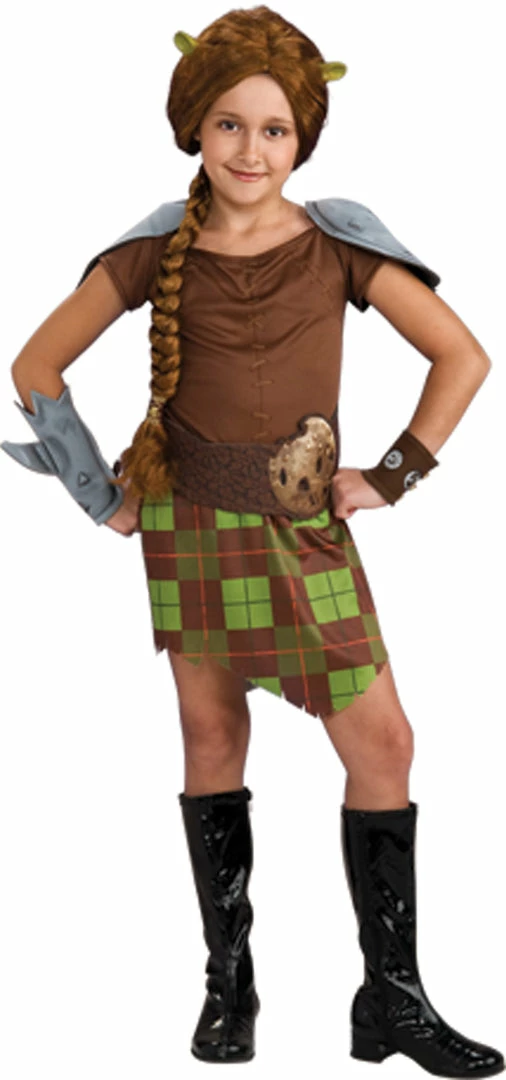 Dress with attached shoulder guards belt cuffs and headband with ears. Small fits children’s size 6-8. Add Fiona Wig RU51984 for the complete look.
