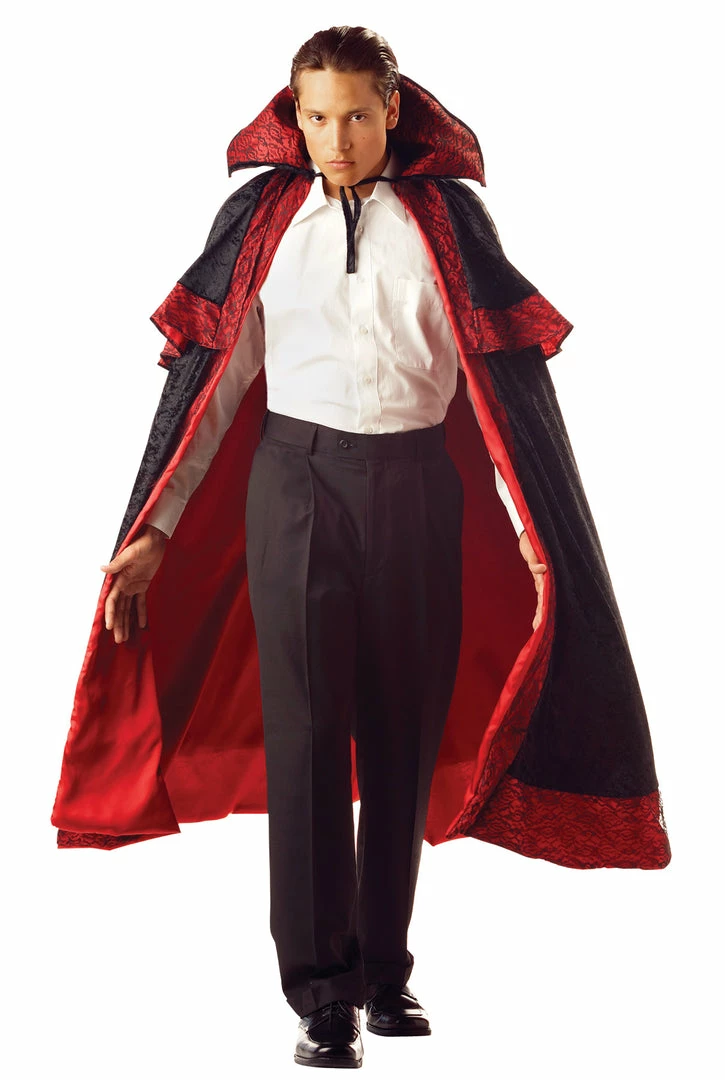 Deluxe knee length black cape with red lining shoulder layers with tie front and standup collar. One size fits most adults.