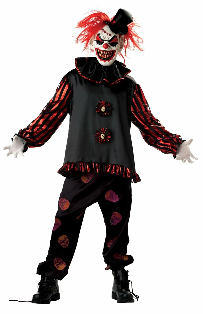 Scared of clowns? You will be! Demented grinning evil clown costume includes long sleeve shirt screen printed skull pants mask with hair hat, and neck ruffle.