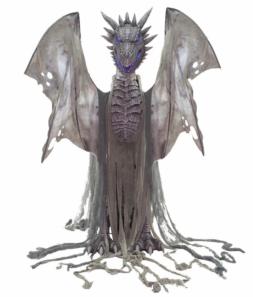 Beware Winter has arrived – and it looks hungry! The Winter Dragon is a magnificent 7-foot tall animated figure featuring molded-plastic head neck chest and legs with matching draped-fabric wings. His wings flap back and forth, head turns from side-to-side, chilling blue eyes light up, and when connected to your fog machine, fog sprays out of his mouth as he roars! Plug the Dragon’s UL power adapter into any standard outlet and choose from Steady-On, Infra-Red Sensor or Step-Here Pad (included) activation options. The infra-red sensor works up to 6.5 feet away and works in all lighting conditions – bright light to no light!