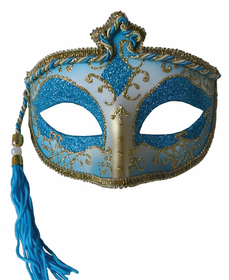 Two tone masquerade mask with glitter detailing, rope accent with tassel attached.