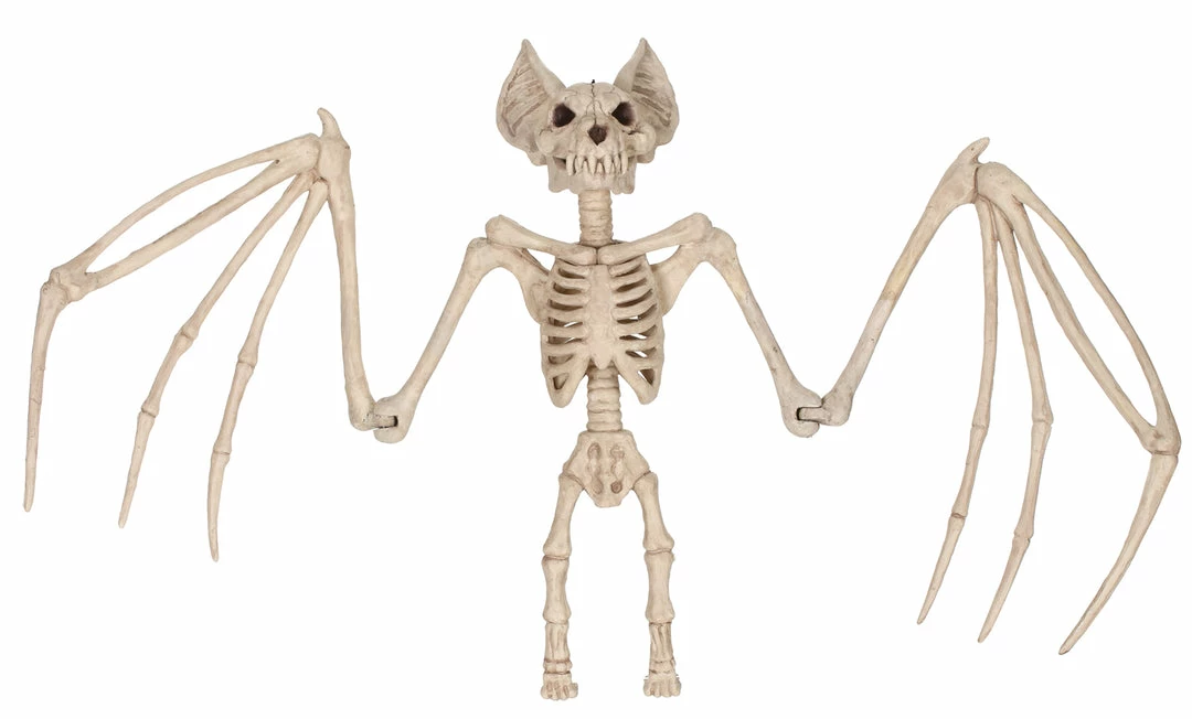 Beware of this frightening vampire bat! The skeleton bat is made from molded plastic and has large pointy ears a sharp toothy grin and long boney wings that fold in for the bat to hang. This icky creature is the perfect addition to your Halloween dcor collection. 36 inch wingspan. Head turns moveable jaw poseable wings that open and closes.
