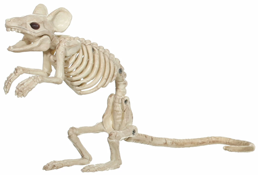 Creepy standing mouse skeleton will add so much to your next haunted scene! Realistic mouse skeleton measures about 11.5 inches including the tail. Natural bone color.