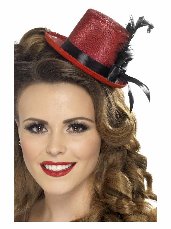 Ladies, complete your burlesque fancy dress costume with the Mini Top Hat. This fancy dress accessory comes with black ribbon and feather.