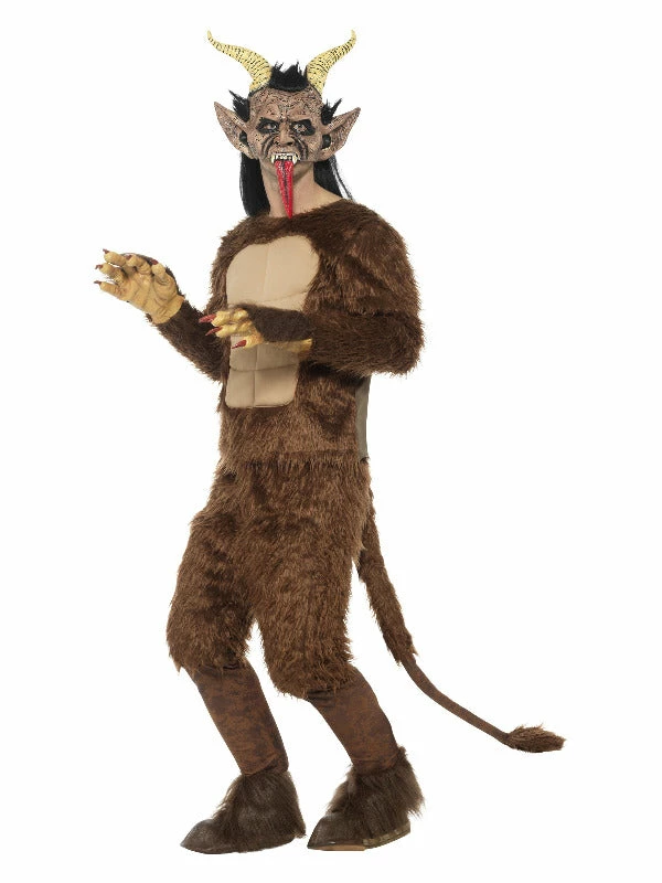 Deluxe Beast / Krampus Demon Costume, Brown, Long Pile Fur, Muscle Chest Top, Padded Trousers, Tail, Mask, Gloves & Hooves