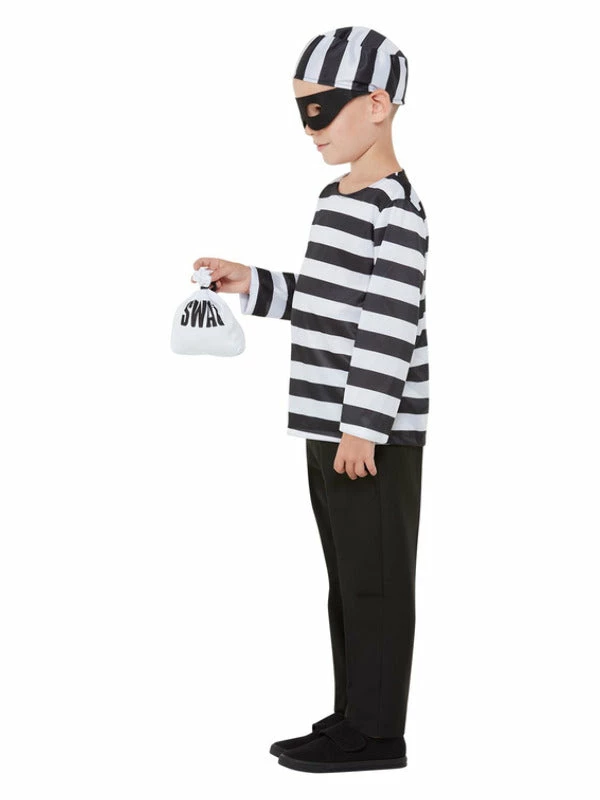 Convict Costume, Black & White, Top, Trousers, Eyemask, Hat & Swag Bag