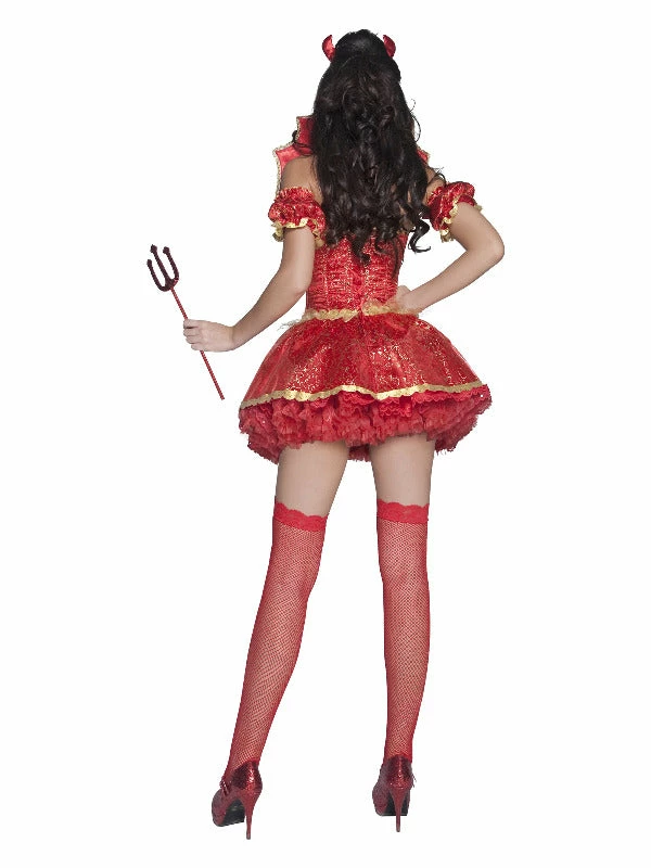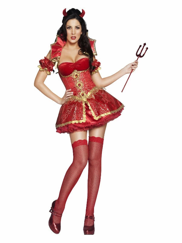 Fever Deluxe Devil Costume, Red, Dress, Corset Overskirt, Collar, Horns & Sleeves