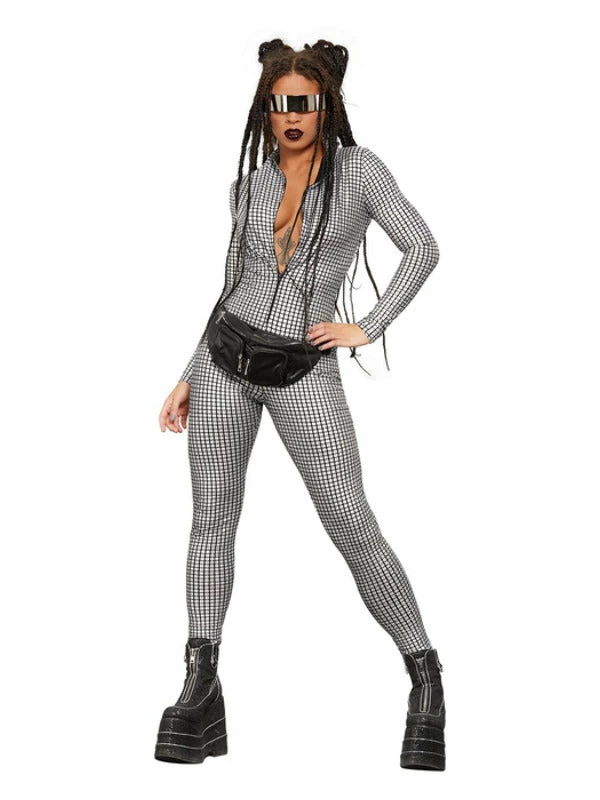 Fever Miss Whiplash Disco Holographic Costume, Zip Up Catsuit