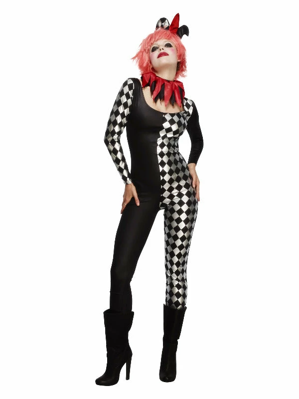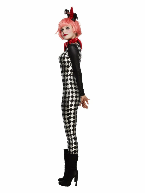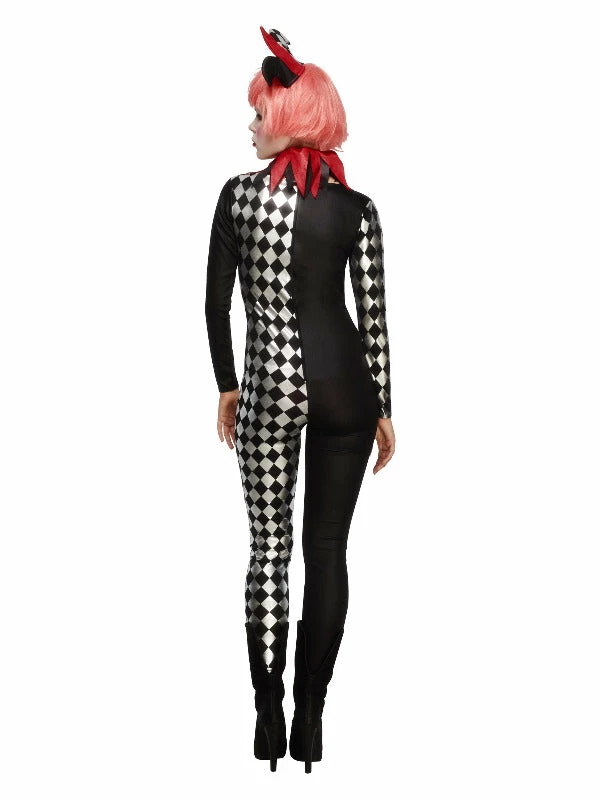 Fever Harlequin Jester Costume, Black, with Catsuit, Collar & Hat on Headband
