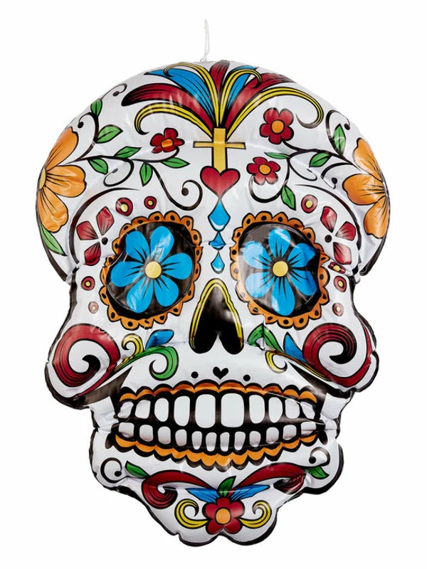 Inflatable Day of the Dead Hanging Skull, White, with Floral Print, 100cm/39in