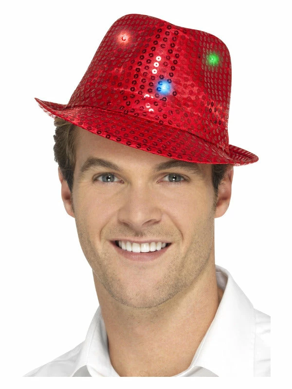 Light Up Sequin Trilby Hat, Red, with Multi-Function LED Lights