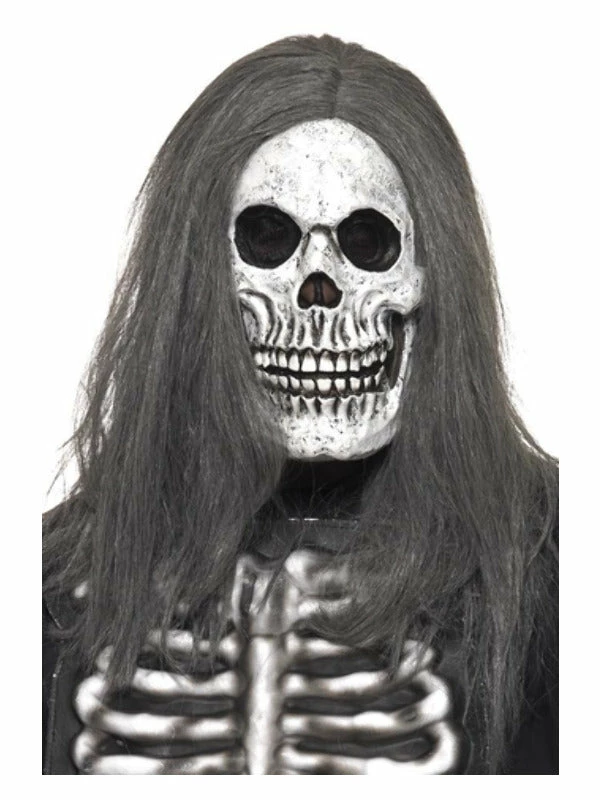 Complete your skeleton Halloween fancy dress costume with the Sinister Skeleton Mask. The foam latex mask comes with long grey hair.
