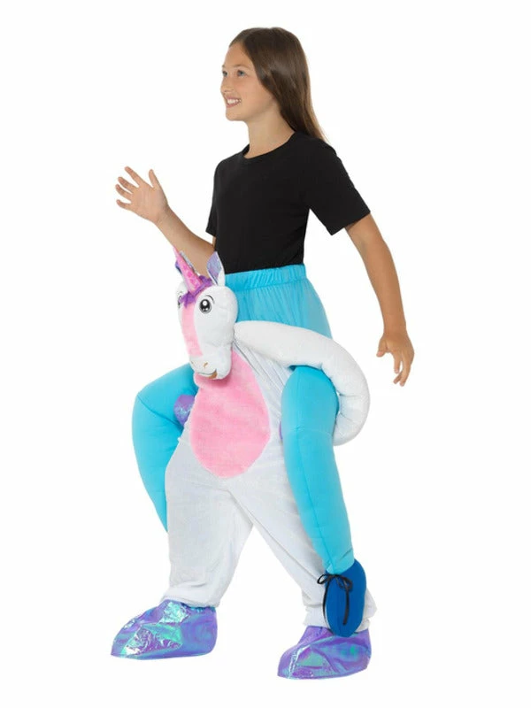 Get ready to ride a Unicorn to your next fancy dress event and show up in our spectacular Piggyback Unicorn Boy’s and Girl’s Costume. This Child’s costume is fantastic for any fancy dress event, and lets it look like a mini Unicorn is giving you a piggyback. Featuring a Pink and White costume with attached horn, fake Blue Legs hangover it’s shoulders to look like you’re sat on the shoulders of a magical Unicorn.