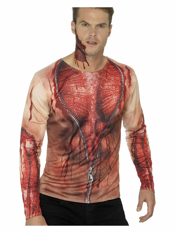 Zipped bloody chest effect halloween men’s top showing muscles. Ideal for that quick costume to wear with any trousers or jeans and match up with a scary mask!