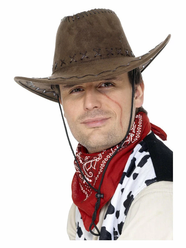 Complete your Wild West cowboy fancy dress costume with the Suede Look Cowboy Hat. Yeehaw!.