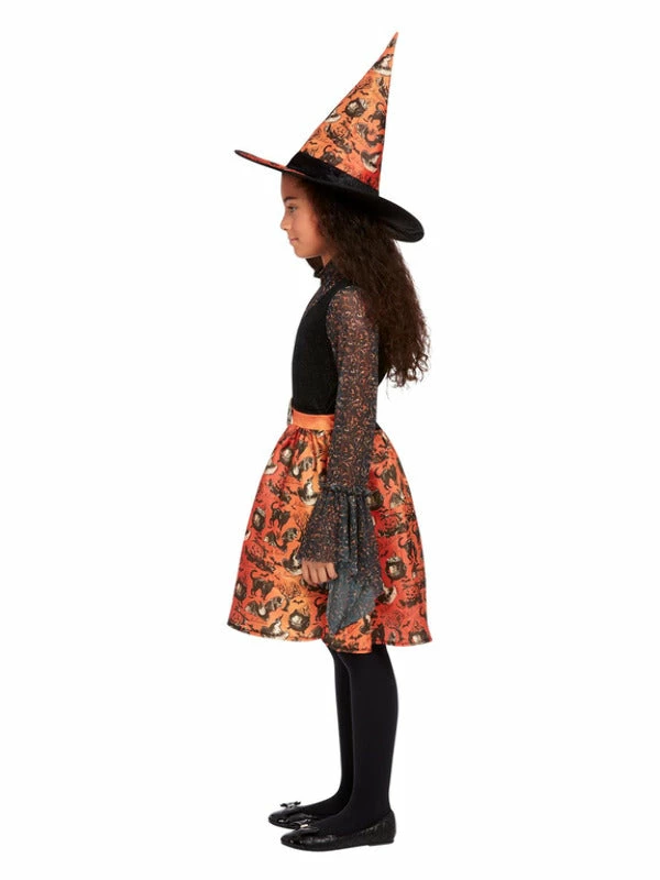Little girls will love dressing up in this orange and black vintage witch fancy dress costume. Perfect for the Halloween Costume Party, plus you can now match up in the ladies matching costume.
