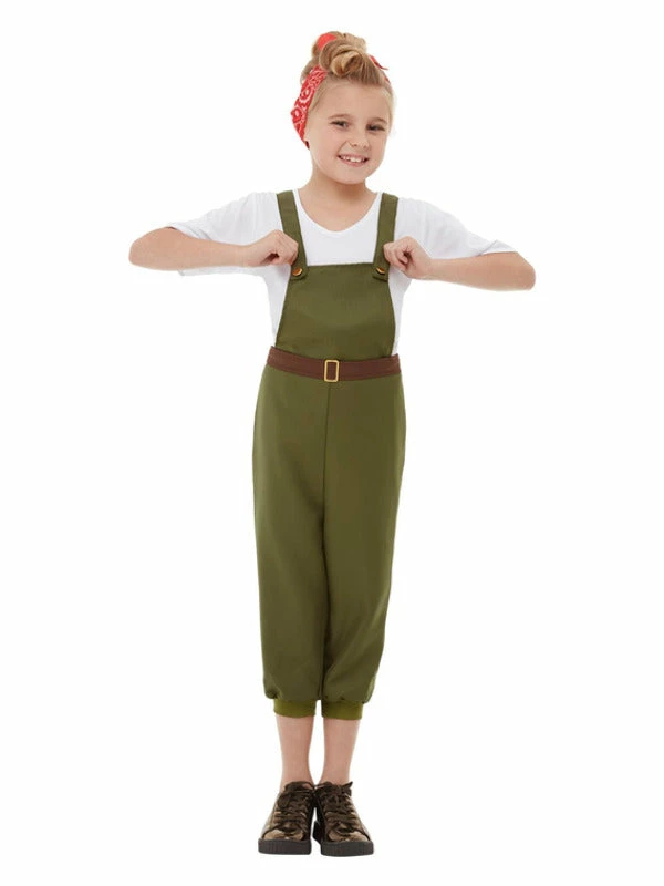 The WW2 Land Girl Child Costume is perfect attire for a Historical party. The authentic 40s military costume includes a top, dungarees and head scarf.Â