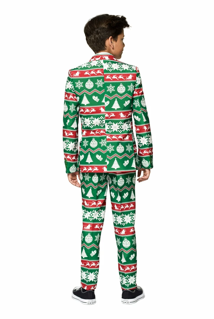 We all know life is for living.. but we believe that you should have a laugh as a family along the way! Your son will be sure to get the attention he deserves once he suit’s up and button’s up in this polished Christmas green nordic Holiday child’s matching funky costume suit. His confidence will soar as he parades at the party tor celebration. Dare to be different, be seen, be bold, and we can guarantee you will make some magical memories along the way.. You’re Welcome!Â