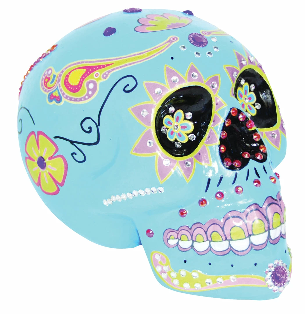 Perfect decoration for your Day of the Dead Party! Colorfully decorated skull in popular holiday theme. This measures approximately 7.5in x 5.5in x 5.9in Blue lightweight foam skull.
