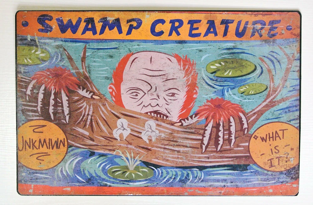 This Antique-looking Metal Sign beckons: Come see the Amazing Swamp Creature! Aged Metal sign hearkens back to the old carnival days where oddities were the big draw! Sign measures approximately 16.9 in x 11in x 0 in.