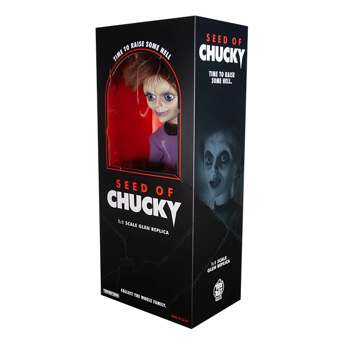 All horror fans and especially the fans of the Child’s Play horror movie franchise are going to love this new doll! The Officially Licensed One-To-One Scale Seed of Chucky Glen Doll is the most screen accurate Glen Doll ever produced. This Doll was developed by Tony Gardner and Alterian Inc. the company responsible for making the actual screen used Doll! Every detail of this Doll comes directly from the actual screen used molds, including the clothing which were replicated using screen used swatches and the shoes. The body of the Doll is made using soft flexible foam surrounded by a dense industrial strength aluminum frame which provides maximum durability and stability to allow you to pose the Doll anyway you’d like! Your order comes with the Doll and an amazing full sized Collectors Seed of Chucky Box.