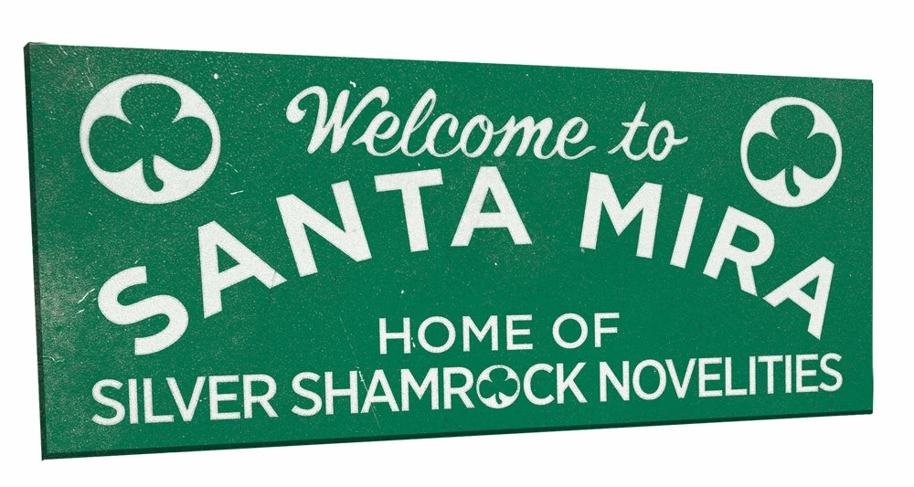 If you want to keep your friends and neighbors guessing, proudly display this Welcome to Santa Mira Home of Silver Shamrock Novelties metal sign in your home, store or garage. This green and white sign is designed to look just like one you would have picked up while on your road trip to Santa Mira, home of the Silver Shamrock Mask company. Beware , you may not know what may come attached to this cute little sign… you may want to look behind you at all times.