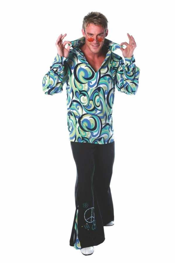 Polyester blue/green shirt and bell bottom pants with matching inset embroidery and studs.