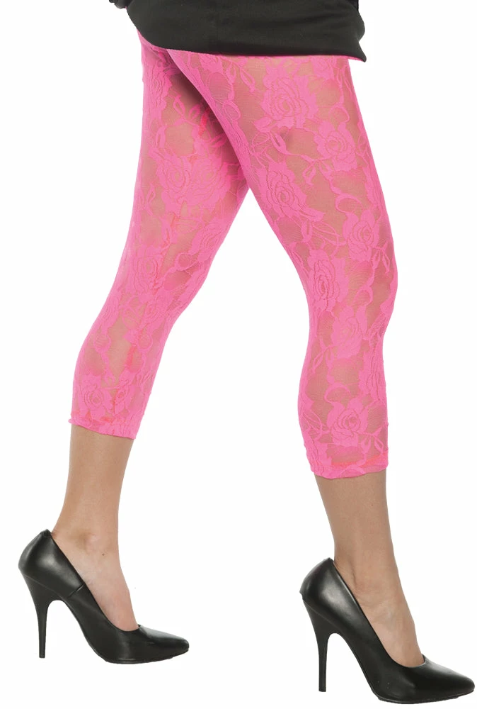 Perfect for your 80’s look! Get ready for a rad time at your pop music themed party! These retro inspired leggings will give your 80’s costume a sassy and funky look! The adult lace leggings are the perfect finishing touch to your 1980’s themed costume. Includes one pair of hot pink rose embossed lace leggings.