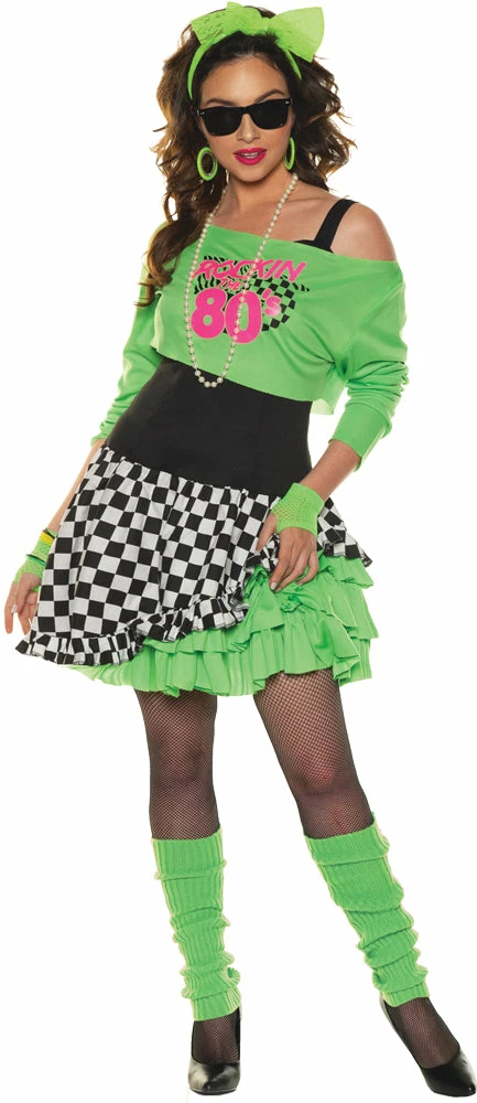 Rock out in this totally bodacious 80’s costume. This retro looking dress is perfect for capturing the 1980’s fashion trend. The Adult Totally Awesome costume includes an off-the-shoulder neon green long sleeve shirt with “Rockin the 80’s” screen print on front. The shirt is attached to a black mini dress with layered skirt. The layered skirt features a black and white checkered pattern with frilly green ruffles underneath. Headband, jewelry, gloves, fishnet stockings, leg warmers and shoes not included.