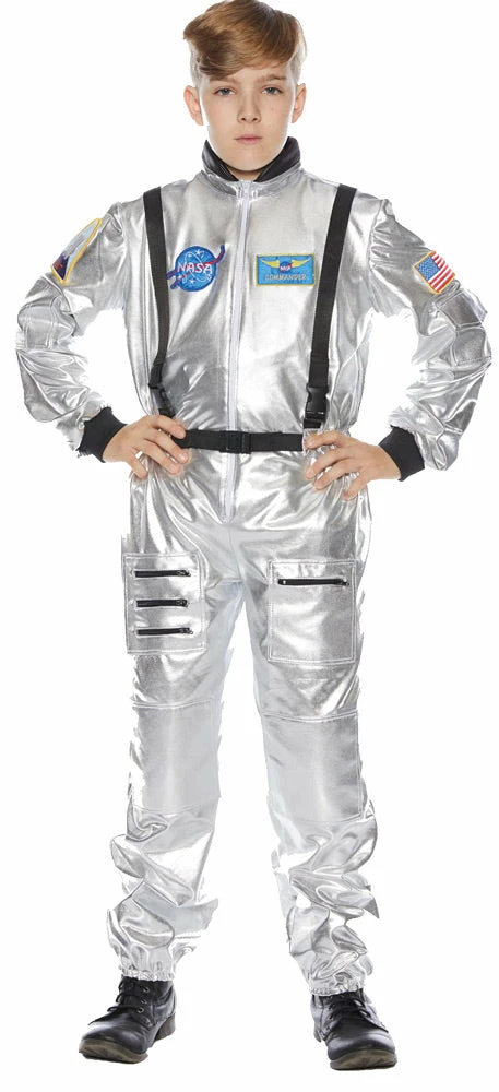 Your kids can dress up like a real astronaut with this authentic-looking Silver Astronaut Costume. The silver jumpsuit has a front zipper and attached NASA patches. Great costume for Halloween theatrical productions or career dress-up days at school! Boots not included.