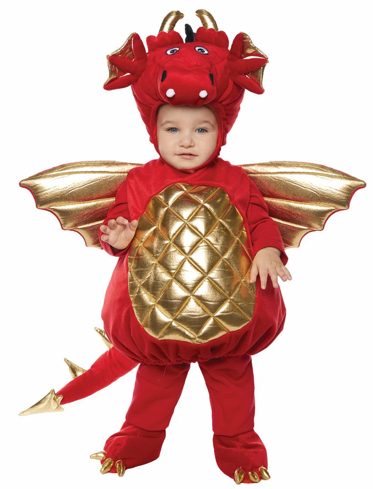 Your toddler will be the cutest dragon in the neighborhood in this vibrant Red Dragon Costume. This adorable costume features a plush sleeveless body with attached gold wings and dragon tail; soft detailed dragon headpiece with Velcro fasteners and matching shoe covers. This toddler costume is cozy cuddly and warm-perfect for a chilly Halloween night of Trick-or-Treating! Shirt and pants not included. 100% polyester. Hand or machine wash; line dry.