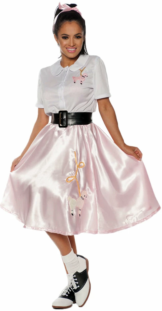 Capture the innocence and fun of the Fabulous ’50’s in this beautifully retro dress your little girl is sure to love! Satin skirt with blouse and black belt. Both skirt and blouse have embroidered poodles. Shoes and headpiece not included.