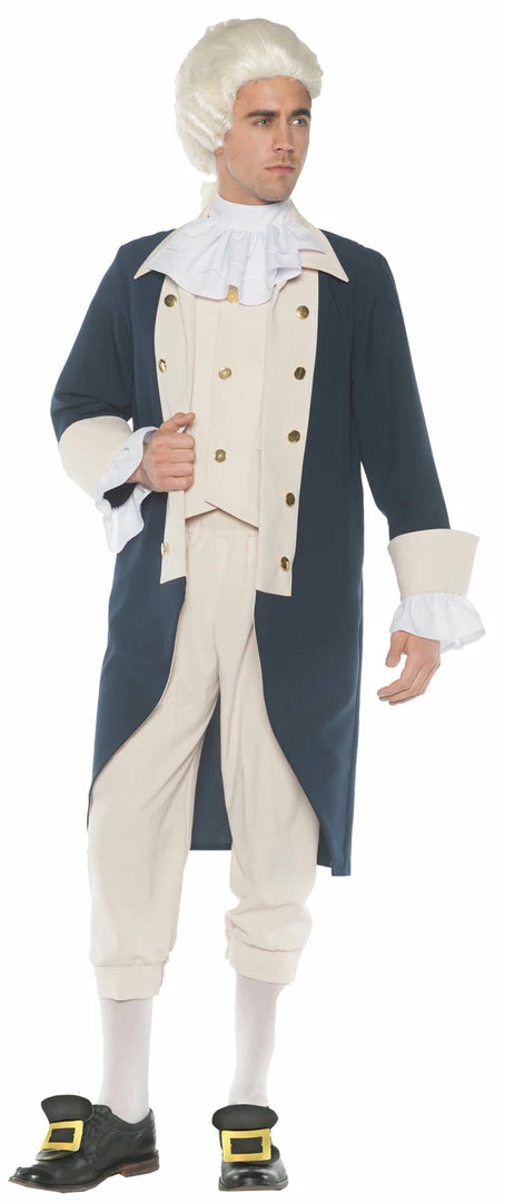Perfect for your next patriotic play or celebration! Detailed jacket with an attached vest and cuffs includes pants and jabot collar.