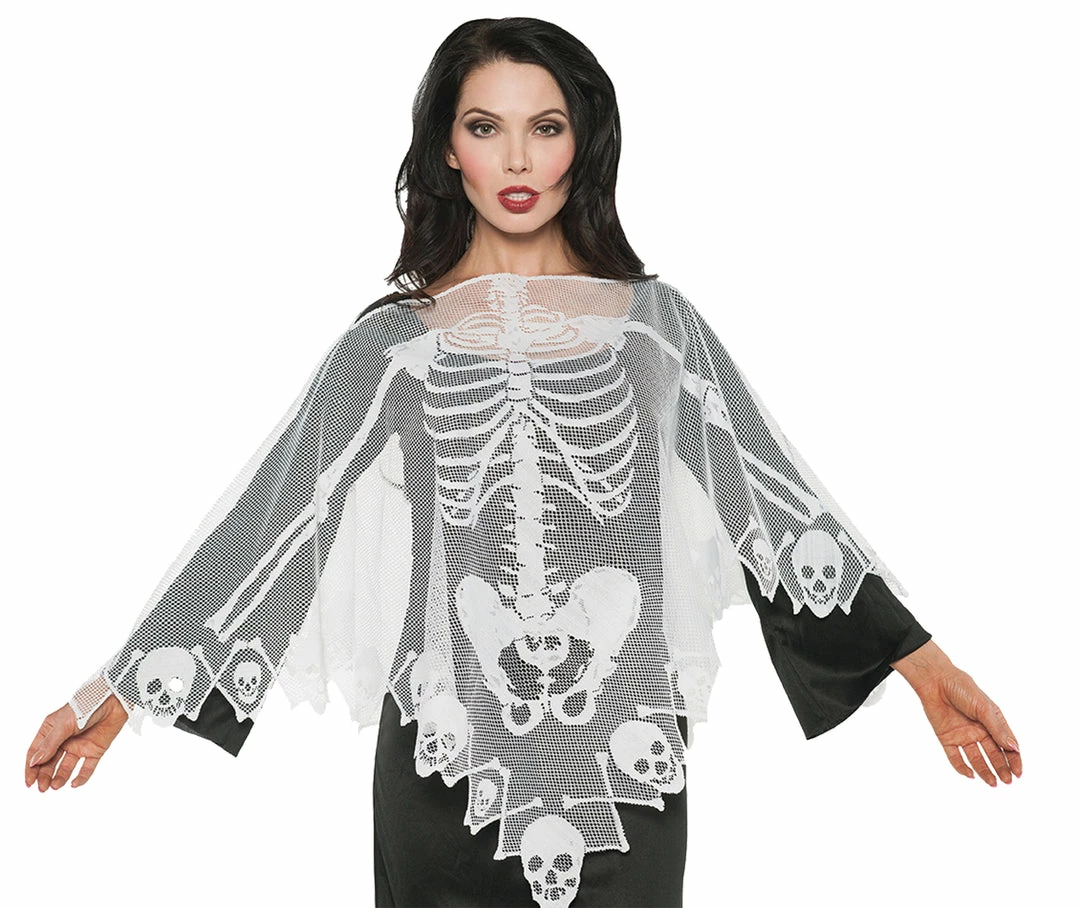A fantastic accessory for any Day of the Dead celebration or anytime you want to attract attention. Very versatile! White lace fully detailed skeletal design poncho. One size fits most adult females.