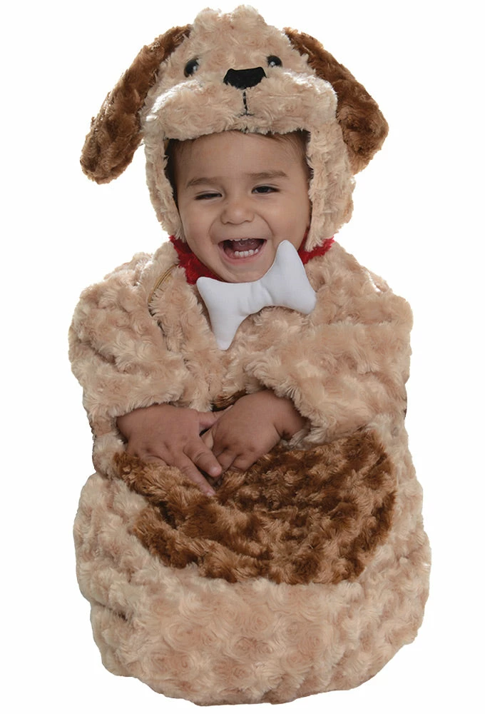 This Infant Puppy Bunting Costume is cute cozy and warm-perfect for your baby’s first Halloween Costume! The baby costume features a super soft plush bunting with attached puppy hood and soft dog bone. Great infant costume for Halloween or photoshoots! 100% polyester. Fits infants 0-6 months height 20 inches-27 inches weight 8-18lbs.