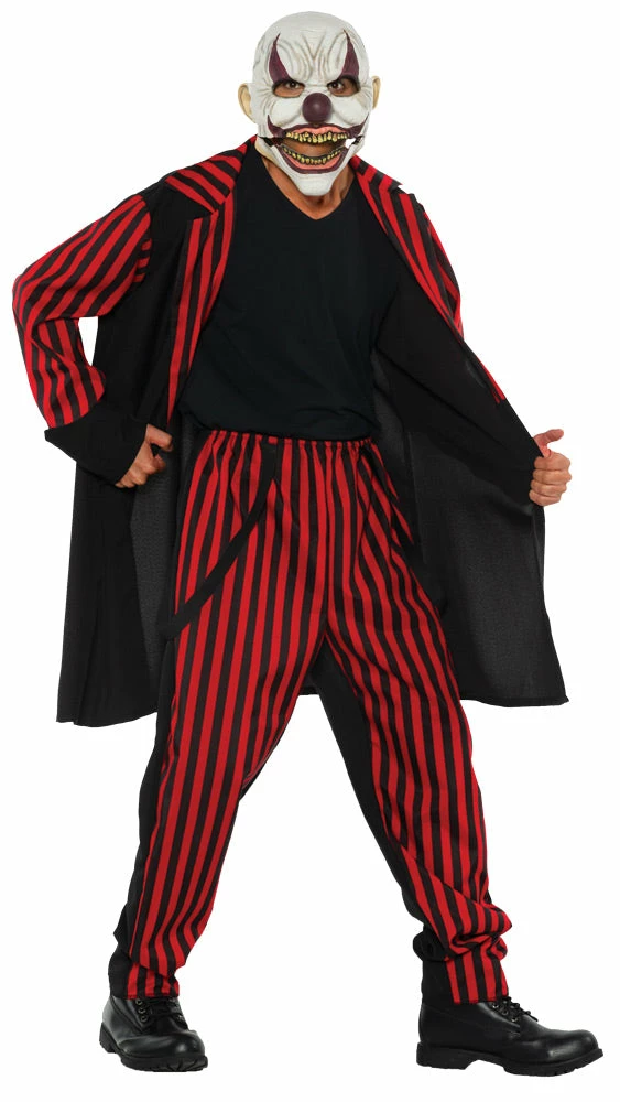 Great for the sideshow and for a lot of other costumes uses as well! Black and red vertical-striped 3/4 length coat and matching pants with attached black suspenders. Lining of coat is black.