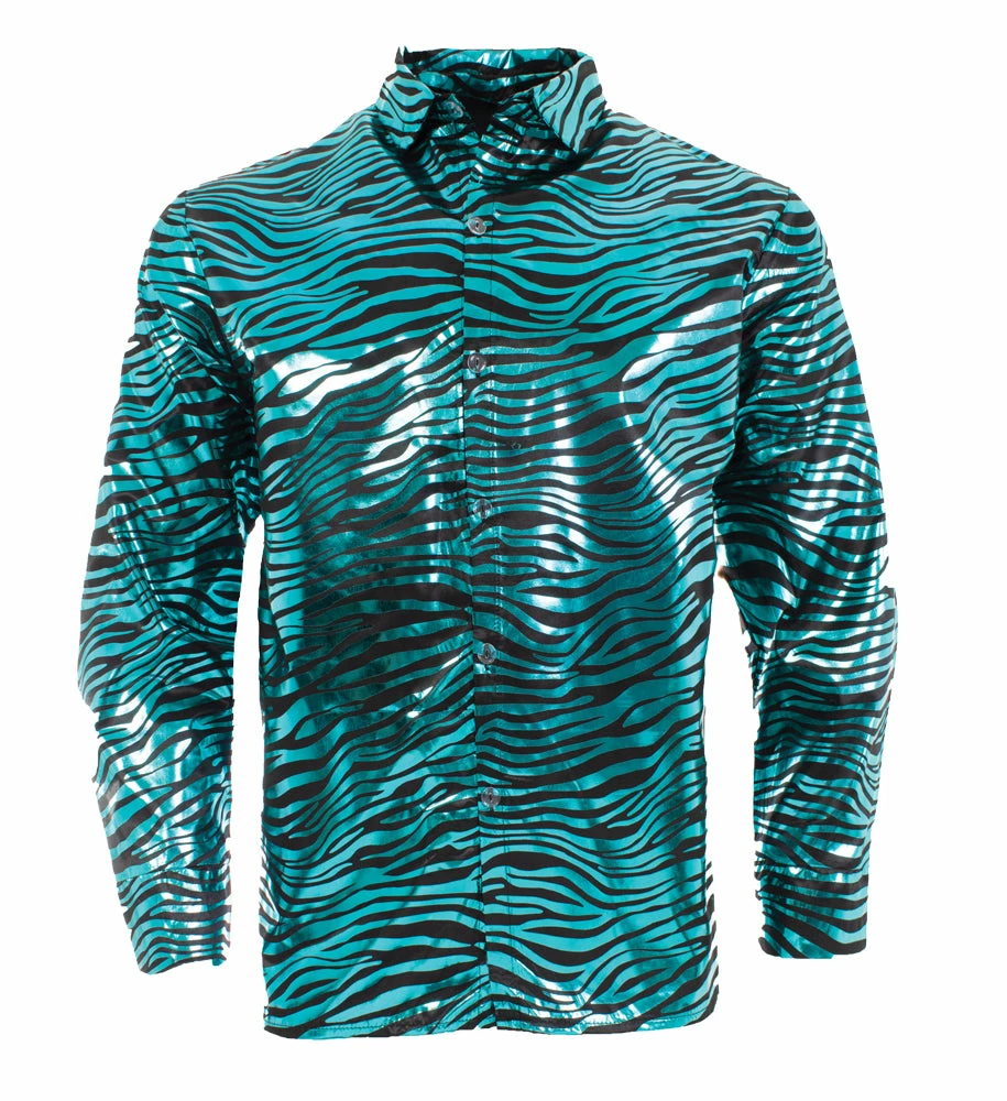 Show off your wild side and be the King in this funky Tiger shirt. Become the king of the jungle when you step out in this shiny blue and black sleeve shirt.